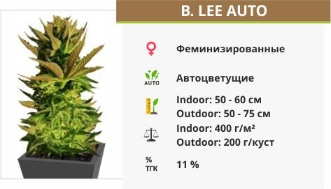 Сорт конопли B. Lee Auto Fem был назван в честь известного мастера восточных единоборств неспроста. Эта маленькая растишка, рост которой достигает отметки в 50-75 см, способна нанести сокрушительный удар прямо в голову даже самому заядлому любителю каннабиса. Она поможет гроверу забыть обо всем на свете, надолго отправив его в далекие космические дали. Девочка также отличается неприхотливостью в культивации, сильной устойчивостью к негативным факторам внешней среды и болезням. Это просто идеальный вариант для новичков, которые лишь начинают усваивать гроверское искусство.