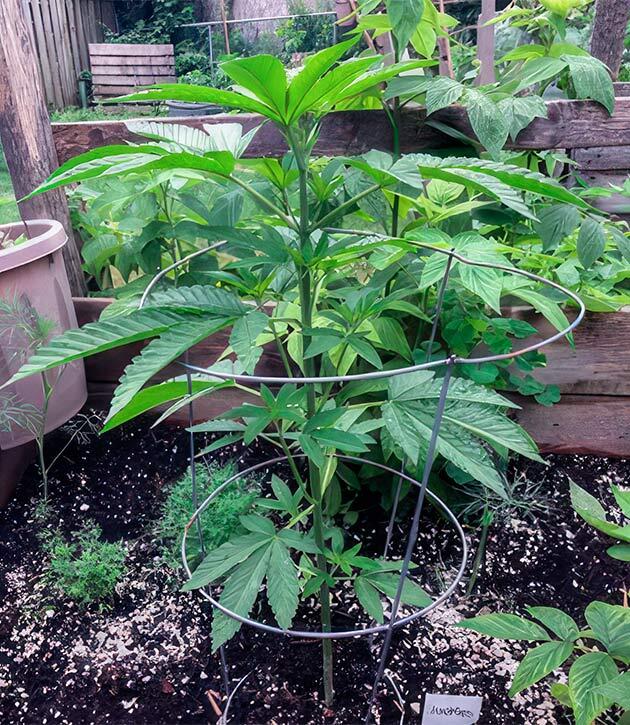 Конопля в аутдоре с подвязкой ветвей и активным ростом