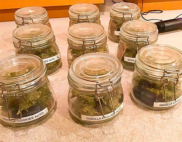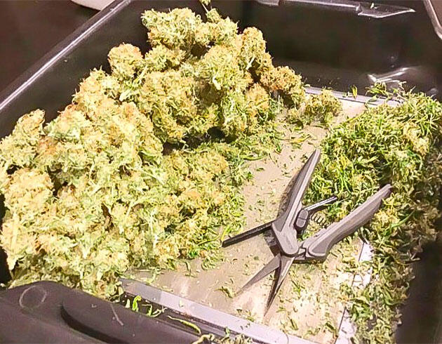 После среза я разделил куст на несколько крупных ветвей. Часть больших листьев убрал сразу. Держал стабильные условия: 25 °C, влажность около 50 %, постоянный обдув. За восемь дней соцветия дошли до нужного состояния, и тогда я занялся финальным маникюрингом. Все шишки улетели в банку на пролечку, а трим собрал отдельно. Результат оказался отличным: 102 грамма плотных и красивых бошек плюс солидная кучка трима, которую тоже можно пустить в дело.