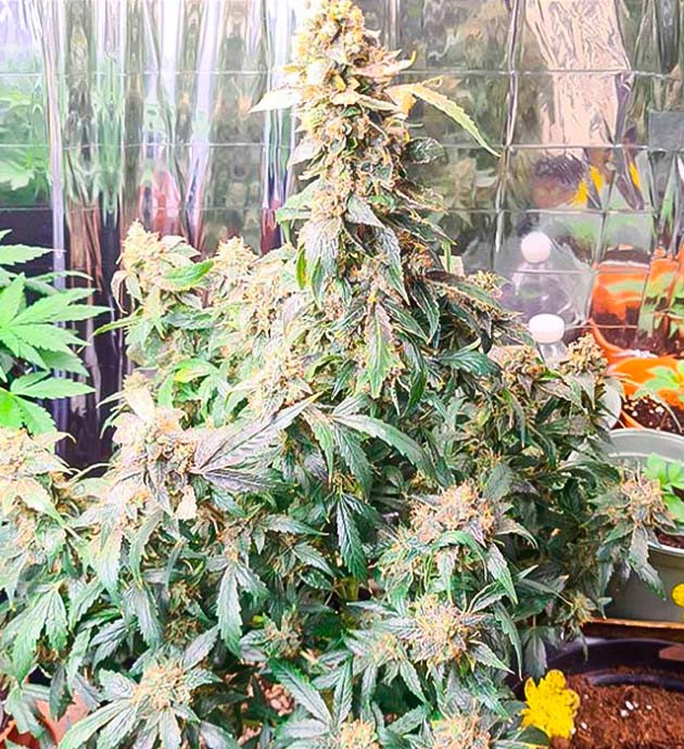 Аромат хотя и достаточно сильный, но, скорее, цитрусовый и фруктовый, чем специфический конопляный. Тренировки, несмотря ни на что, растишка перенесла неплохо. Вроде и стрессовала, но полностью восстановилась, и к харвесту рост был более восьмидесяти сантиметров. При этом мне удалось сформировать густую и красивую крону.