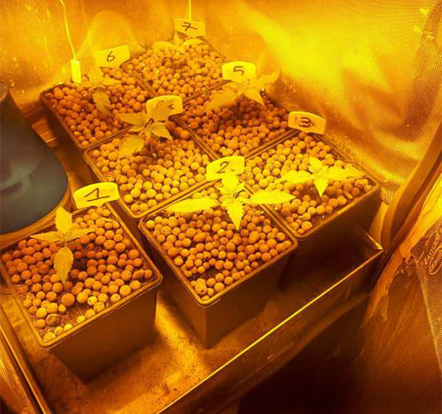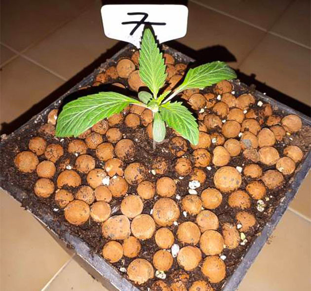 Все семь саженцев проросли в один день, что меня приятно порадовало. Скинули каски тоже плюс-минус синхронно, никто сильно не отставал. Как только сформировались первые пары настоящих листьев, я насыпал в горшки немного керамзита, чтобы влага лучше удерживалась в почве и не так быстро испарялась. В общем, нормальное постепенное развитие саженцев. Поддерживаю в гроубоксе стабильные условия: