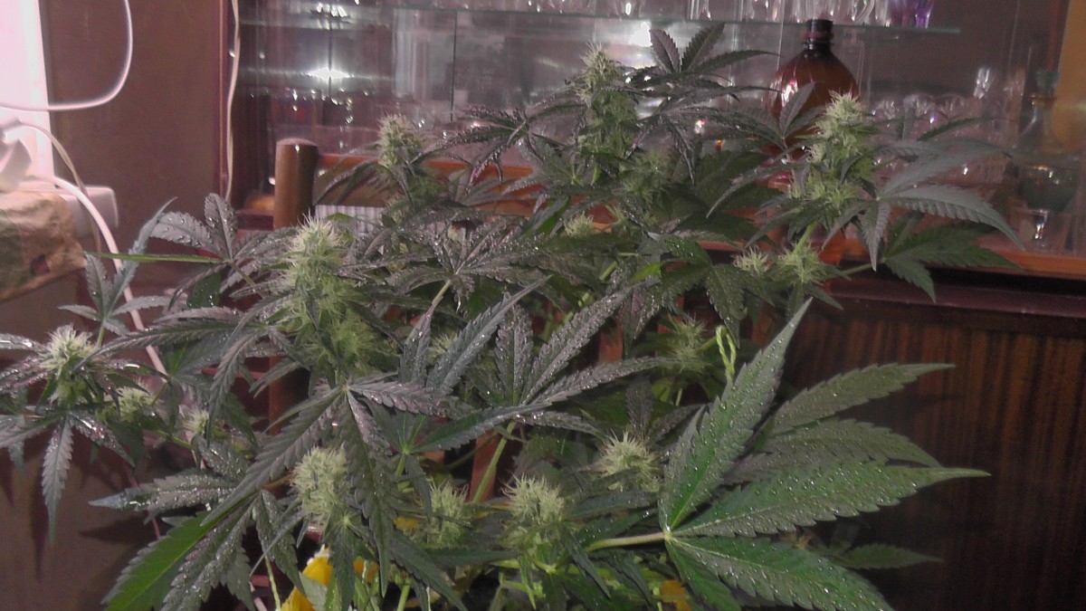 Вырастил на улице два куста, всем "этажам" куста требуется достаточно света, обрезал кучу листьев у ног, на одном из кустов подогнул стебель, и получил на выходе чуть больше чем на первом, средний урожай, с первого получился 70 грамм, а на втором 90 грамм, в финальной стадии цветения шишки покрываются белым "инеем", очень маслянисты.