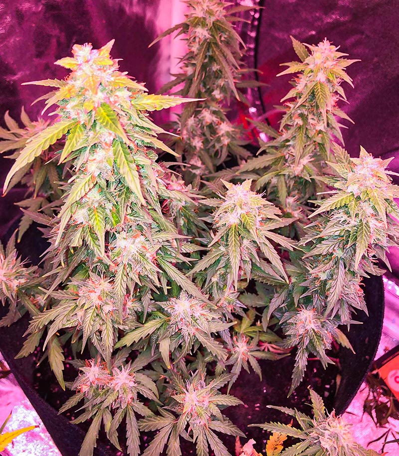 Более внушительных результатов можно добиться в индоре. При культивации в небольших боксах рекомендуется применять техники тренировок с низким уровнем стресса. Использование сеток ScrOG и подгиб LST показывают высокую результативность, но начинать их реализацию необходимо как можно раньше, чтобы к началу цветения кустики уже приняли нужную форму. Лампы лучше использовать современные LED с полным спектром, но подойдут и старые добрые ДНаТ. В плане мощности хватит 100-150 светодиодных Вт и до 300 Вт газоразрядного света. Оптимальный режим – 18-20 часов света на протяжении всего цикла. Урожай можно собирать спустя 8-9 недель после посадки, а квадрат полезной площади принесет около 400 г морозных от плотной смолы соцветий.