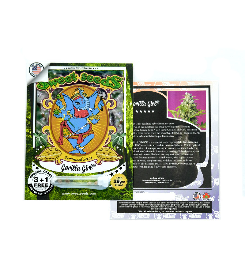 Сорт Gorilla Girl бридеры испанского банка Sweet Seeds был получен путем скрещивания двух чемпионов. Феминизированный каннабис содержит гены Gorilla Glue и Girl Scout Cookies. Образец GSC, взятый для этого скрещивания, происходит из фенотипа Thin Mint. Итогом стал феминизированный каннабис с уровнем ТГК 20-31% с крайне мощным воздействием на разум.